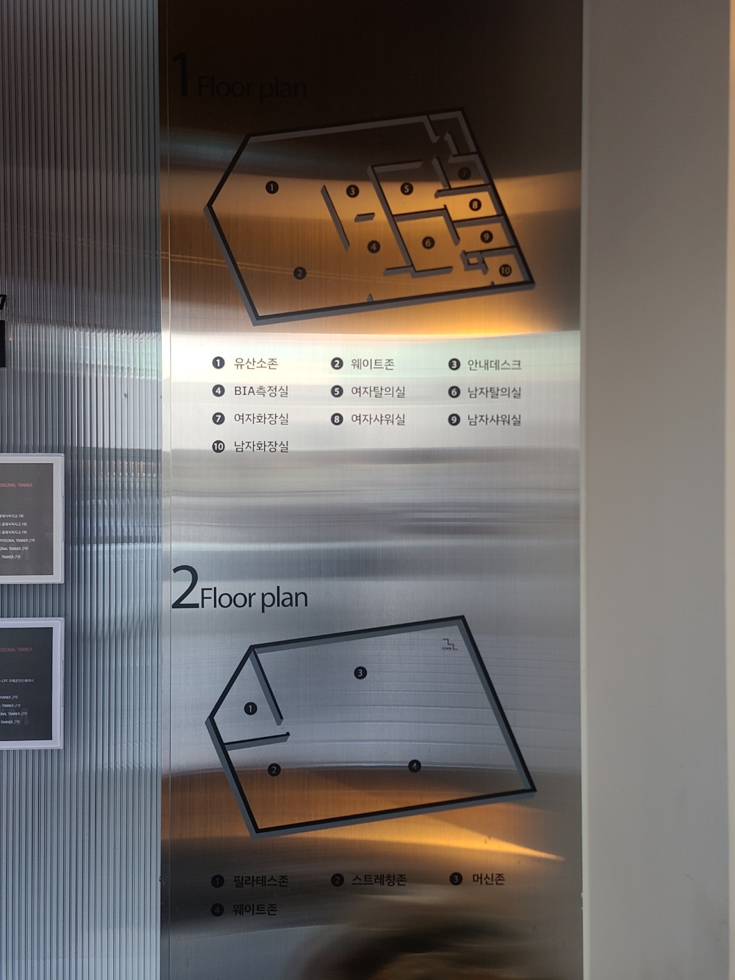 1층에는 화장실과 샤워실 운동복 라커룸 및 간편하게 찾을 수 있는 약도가 있습니다. 총 1층과 2층으로 나누어져 있으므로 약도를 보시면 좀 더 간편하게 처음 오더라도 이용하시기 편합니다. 그리고 PT 지도자분들의 프로필이 있어 본인이 원하는 PT 지도자의 경력을 보고 PT를 신청할 수 있는 장점이 있습니다. 신축이라 그런지 확실히 깔끔해 보입니다.